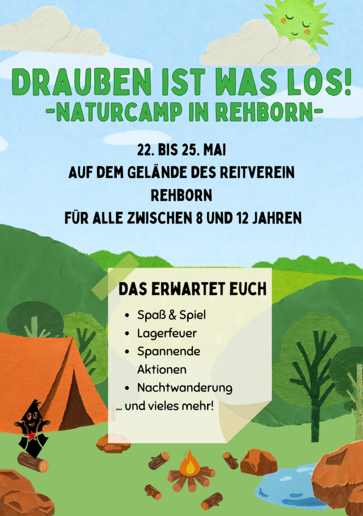 Dieses Jahr geht es über Pfingsten unter dem Motto “Draußen ist was Los!” auf das Gelände des Reitvereins Rehborn. Dort wollen wir getreu unserem Motto mit viel Spaß, Spiel und Spannung die Natur und die Umgebung erkunden und erleben. Beim Programm ist für alle etwas dabei: von entspannt bis actionreich, von künstlerisch bis handwerklich. Auch die Nacht werden wir nutzen und mit denen die wollen eine kleine Nachtwanderung unternehmen. Ein Lagerfeuer darf natürlich nicht fehlen! Wir werden in großen Gruppen-Zelten schlafen.
